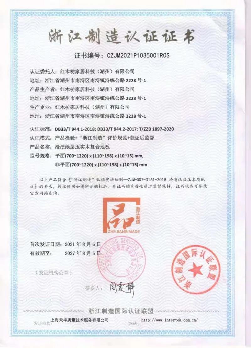 捷報!紅木枋地板喜獲“浙江制造認證證書”