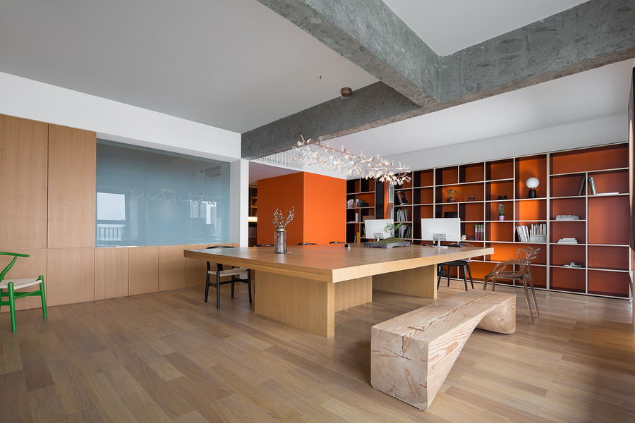 切換一個角度看看會議室內部,整體以木材為裝飾主材,地面上淺淡的木地板配上木質造型長凳,就算在討論時觀點再激烈,就算會議時間再冗長也能讓人放松下來。因為木,夠溫和。