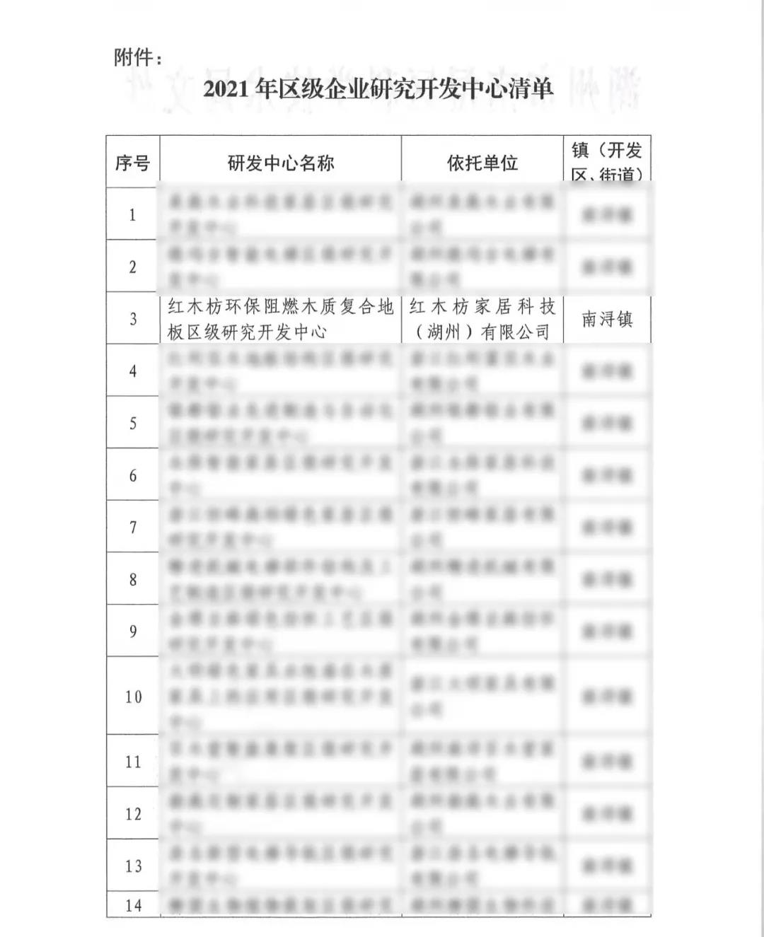 近日,湖州市南潯區科學技術局正式下發《南潯區科學技術局關于認定2021年度區級企業研究開發中心的通知》(潯科發〔2021〕6號),根據《湖州市南潯區企業研究開發中心認定管理辦法》有關規定,經審核認定,紅木枋家居科技(湖州)有限公司地板研發實驗室為2021年區級企業研究開發中心。