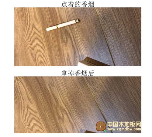 一根點(diǎn)燃的香煙,放在地板上三十秒鐘……時(shí)間到了之后,拿起香煙,地板表面沒有絲毫損壞。
