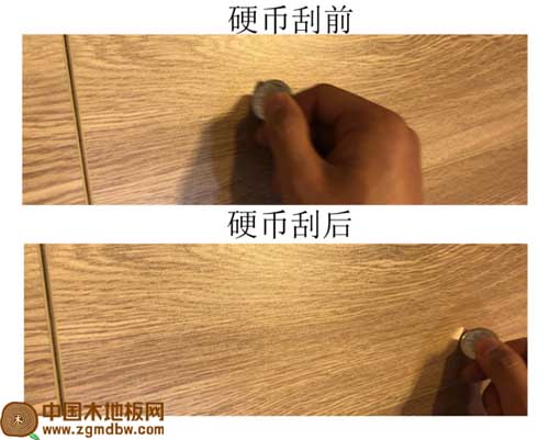 測(cè)試人員用一枚一元硬幣在地板上反復(fù)刮擦,無論輕重與否,地板表面沒有出現(xiàn)起皮、劃痕等現(xiàn)象,表面依舊如新,完美無瑕。經(jīng)測(cè)試可以發(fā)現(xiàn),地板耐磨性可見一斑。